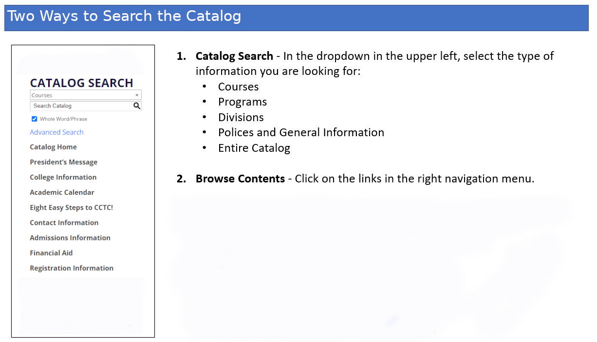 Need a hard copy? Click the print icon at the top of any page within the Catalog and generate a pop-up page formatted to print neatly |
